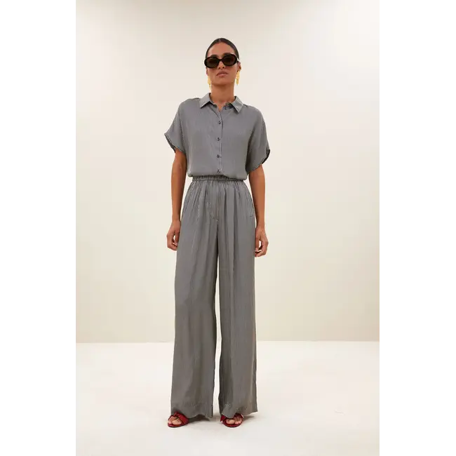 De By-Bar Benji Silky Stripe Pants in Jet Black Stripe is een elegante en comfortabele broek die moeiteloos comfort en stijl combineert. Deze broek heeft een losvallende casual fit met een hoge taille die je silhouet flatteert en een verfijnde uitstraling geeft. De lange, brede pijpen en stijlvolle streepdessin maken het item perfect voor ontspannen dagen waarop je er toch verzorgd uitziet.