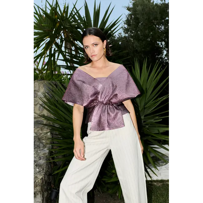 De Dusty Lilac kleur — een zachte, pastelachtige lila-tint met een metallic shimmer — geeft een elegante en modieuze uitstraling die makkelijk combineert met jeans, pantalons of een rok. Draag deze top solo met sneakers voor een daytime look of met hakken en een blazer voor een avond-outfit. Een veelzijdige must-have om online te kopen en te bestellen bij Fraai Supply als stijlvolle basic met een twist.
