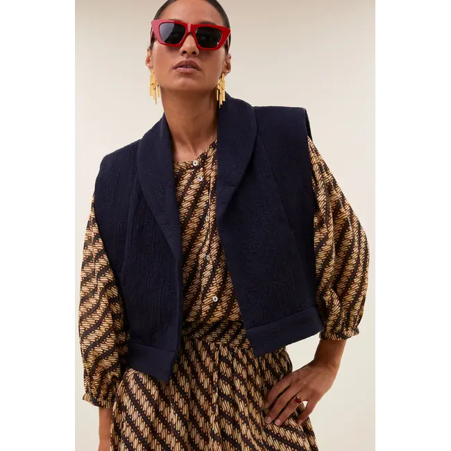 De By-Bar Suzie Jacket in Captain Blue is een trendy, veelzijdig item dat comfort en moderne stijl combineert. Dit mouwloze jack heeft een normale pasvorm, een subtiel jacquard-patroon voor een elegante look en handige zijzakken die praktische functionaliteit toevoegen zonder afbreuk te doen aan de stijl. Het item is ideaal om casual te dragen over tops, blouses of dresses voor een relaxed maar toch verzorgd silhouette.