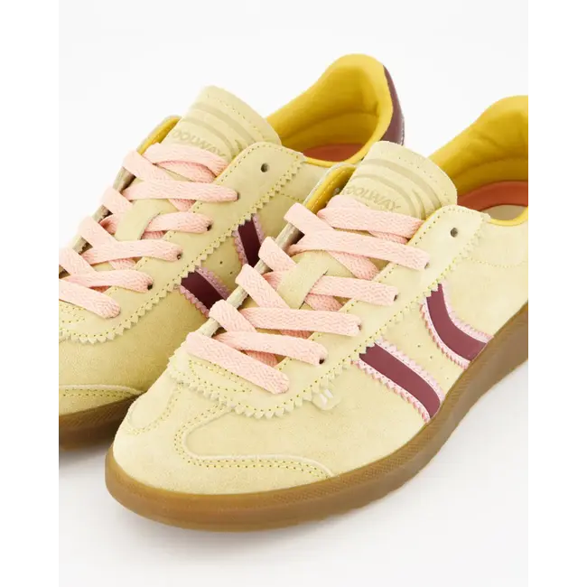 De Coolway Kiro Yellow Blaze sneakers zijn een eye-catching retro-stijl sneaker met moderne functionaliteit, ontworpen voor dames die comfort en urban flair willen combineren. De sneaker is grotendeels uitgevoerd in suède en heeft een gedetailleerde tong met het Coolway-logo, een gewatteerde leren voering bij de kraag en een dubbele vetersluiting met verwisselbare veters voor een persoonlijke look.