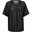 Dit stoere zwarte t-shirt heeft een meshlook en een subtiele glim voor een opvallende uitstraling. Met korte mouwen, V-hals, knoopjes aan de voorkant en letters op de borst is het een echte eyecatcher. Draag het casual of geef je outfit een edgy twist!