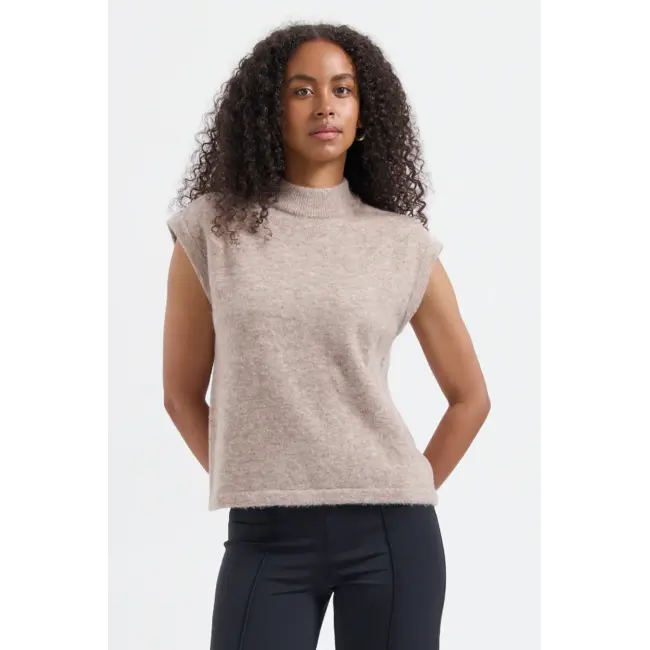 De Avec Ēlan Ella Top in Taupe is een elegante en tijdloze knit top die je basisgarderobe naar een hoger niveau tilt. Deze mouwloze top heeft een hoge halslijn en een subtiel gesculptuurde pasvorm, wat zorgt voor een moderne en verfijnde look. Dankzij de hoogwaardige blend van alpaca-wol en wol met een vleugje elastaan en polyamide voelt de top heerlijk zacht aan en biedt hij warmte én comfort — ideaal voor zowel casual als chic gestylede outfits. De Taupe kleur geeft een warme, natuurlijke uitstraling en is eenvoudig te combineren met broeken, rokken of lagen onder een blazer of cardigan voor een complete look. Perfect voor dagen waarop stijl én comfort samenkomen.