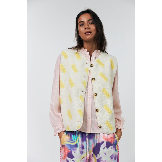 De lichtgele kleur geeft het vest een frisse en moderne uitstraling, terwijl de contrasterende biesjes en speelse details zorgen voor die typische Lollys Laundry-look: een beetje eigenwijs, maar altijd stijlvol. De ronde hals en knoopsluiting maken het vest makkelijk te dragen over een T-shirt, blouse of longsleeve.