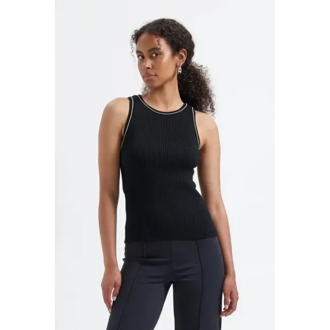 De Avec Ēlan Juul Top in Black is een stijlvolle en minimalistische mouwloze top met een moderne, verfijnde uitstraling. De top is uitgevoerd in een geribbelde structuur met subtiele contrasterende details bij de halslijn en armsgaten, wat zorgt voor een clean én modieus accent. Gemaakt van een zachte katoen‑acryl mix biedt deze top lichte ondersteuning en een comfortabel draaggevoel, ideaal voor dagelijks gebruik. Dankzij de regular fit pasvorm valt de top true‑to‑size en combineert hij moeiteloos met jeans, tailored trousers of onder een blazer voor een veelzijdige look. Voilà: een tijdloze basic die elke outfit effortless chic maakt.