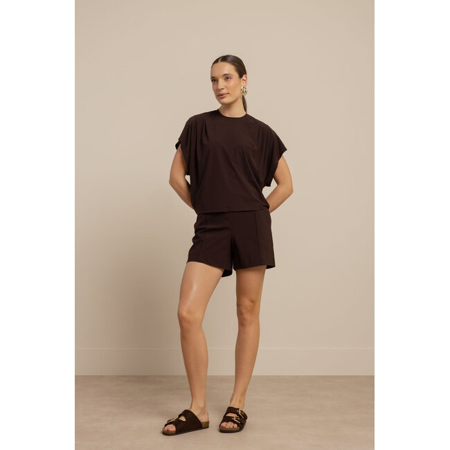 Deze top is vervaardigd van hoogwaardige travelstof, die soepel aanvoelt en kreukvrij blijft. De warme espresso-kleur maakt dit item makkelijk te combineren met andere basisstukken zoals jeans, pantalons of rokken, maar werkt ook perfect onder een blazer of vest voor een smart-casual outfit.