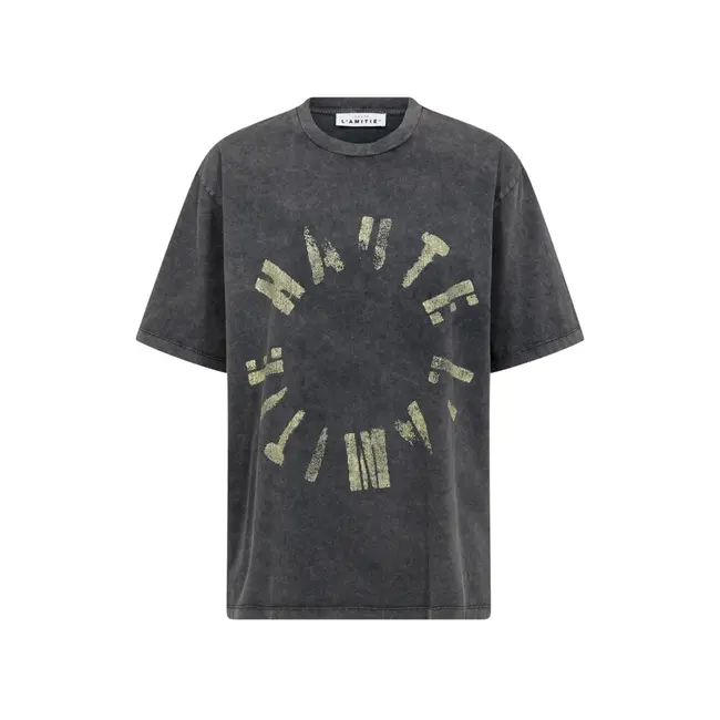 De Logo Circle Tee Black Acid Wash (HL10608) van Haute L'Amitié is een moderne en edgy dames top met een uitgesproken streetwear uitstraling. De unieke black acid wash finish geeft het T-shirt een stoere, licht vintage look die perfect aansluit bij de huidige trends.