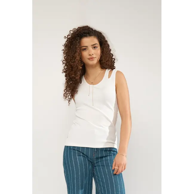 De top is uitgevoerd in de tijdloze kleur Bright White (wit) en laat zich moeiteloos combineren met zowel casual als meer geklede outfits. Draag hem op een jeans voor een relaxte look of combineer met een blazer of pantalon voor een elegante uitstraling.