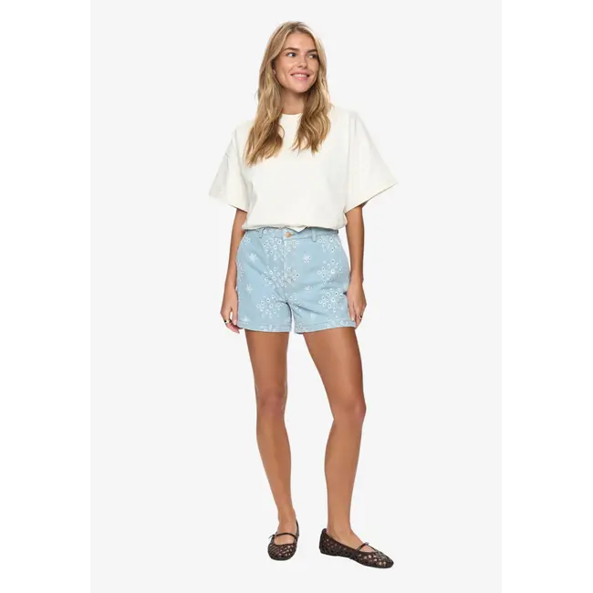 De lichtblauwe denimkleur geeft de shorts een casual en tijdloze uitstraling, waardoor ze eenvoudig te combineren zijn met verschillende tops en blouses. Dankzij het zachte en ademende materiaal bieden de shorts optimaal draagcomfort, ideaal voor warme dagen.