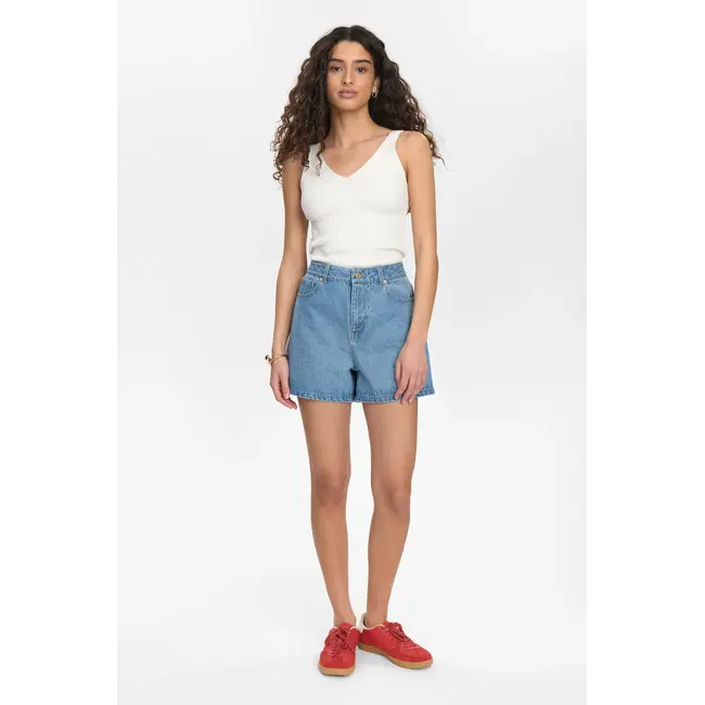 De short heeft een high waist pasvorm, wat zorgt voor een flatterend silhouet en een comfortabele fit. De lichte denim wash geeft de short een frisse en zomerse look die eenvoudig te combineren is met verschillende tops en blouses.