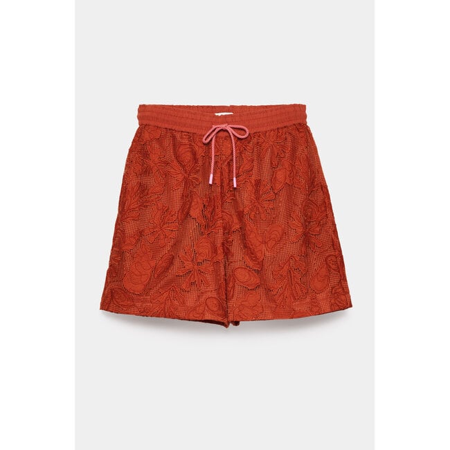 Wat deze short uniek maakt, is de in-house ontworpen lace structuur met subtiele patronen geïnspireerd op schelpen en koraal. Dit geeft de short een luxe en opvallende uitstraling die perfect past bij zonnige dagen en vakantie vibes.