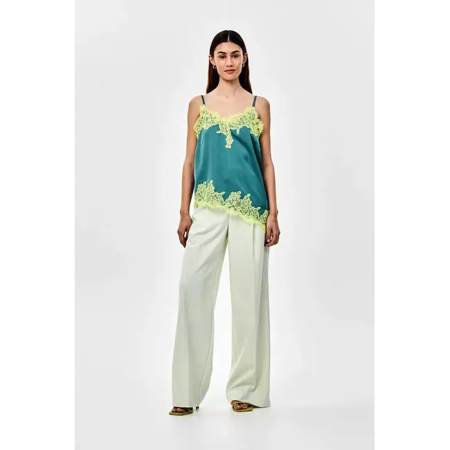 De top is uitgevoerd in een soepelvallende stof met delicate lace details langs de halslijn en zoom. De contrasterende kant in een frisse kleur geeft het geheel een speelse en zomerse touch. De dunne schouderbandjes en de losvallende pasvorm zorgen voor een luchtige en comfortabele fit, ideaal voor warme dagen.