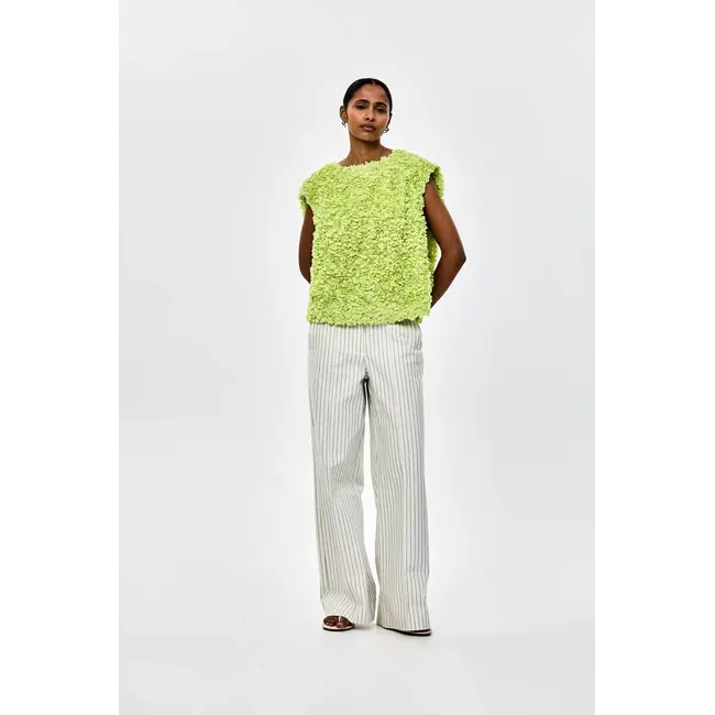 De mouwloze top heeft een oversized pasvorm en is uitgevoerd in een bijzondere stof met een subtiele 3D-bloementextuur. Dit geeft het item een luxe en unieke uitstraling die direct opvalt. Dankzij de luchtige en comfortabele fit is deze top ideaal voor warme dagen en zomerse events.
