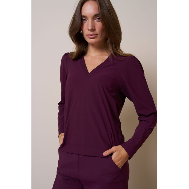 De Studio Anneloes Valdis Top in Blackberry is een stijlvolle essential die vrouwelijkheid en comfort perfect combineert. Deze top heeft een regular fit met een flatterende V‑hals en lange mouwen, afgewerkt met subtiele pofmouw‑details bij de schouders voor een speelse, moderne touch.